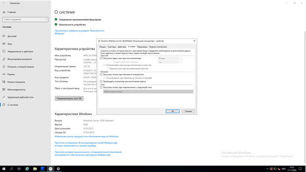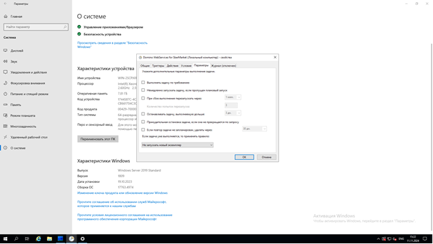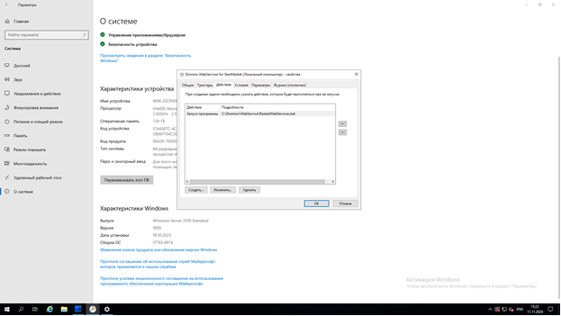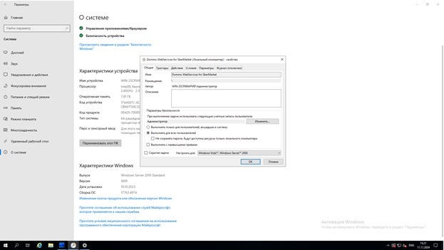 - Создать задание планировщика windows для автоматического запуска сервиса при старте windows. Параметры задания на скриншотах ниже