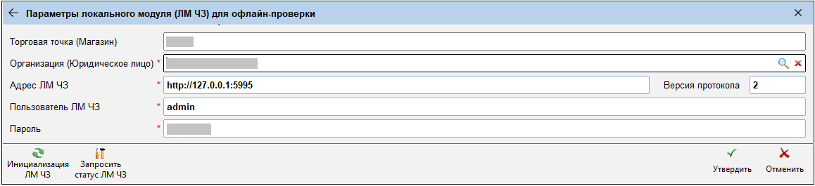 В окне настроек можно увидеть (если настроены) адрес ЛМ ЧЗ, версию протокола, логин и пароль доступа. Для проверки правильности настроек и работоспособности ЛМ выполните запрос текущего статуса ЛМ.