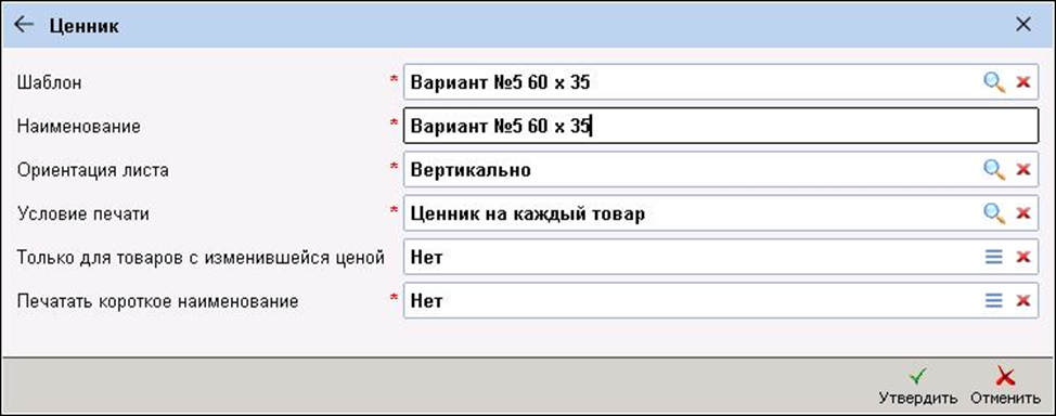 Для каждого ценника кроме названия и шаблона указываются параметры печати: