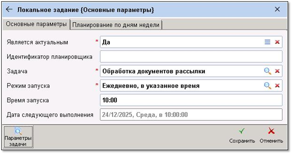 Задание не требует дополнительных параметров. Все необходимые данные процедура планировщика получает из документов рассылки.