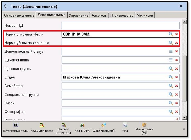 2. В карточках товаров с типом измерения Штучный и Весовой появляются пола для ввода норм убыли: