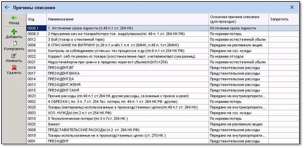 Если при списании необходимо указать причину, которой нет в кодификаторе, рекомендуется использовать справочник. В отличие от кодификатора, причины в справочник добавляются пользователями. Для доступа к справочнику необходимо установить у параметра Использовать расширенный справочник причин списания значение Да.