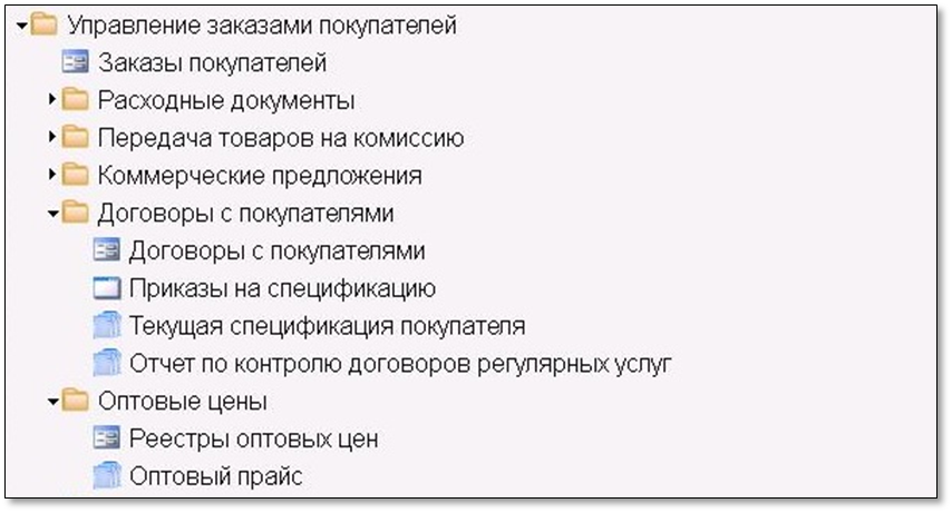 Заказы покупателей, созданные на их основе документы реализации, договоры с покупателями, приказы на спецификацию и реестры оптовых цен расположены в меню Управление заказами покупателям.